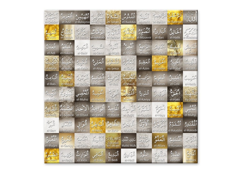Allahın 99 İsmi Hardal Gri Beyaz Renklerle Tek Parça Kanvas Tablo